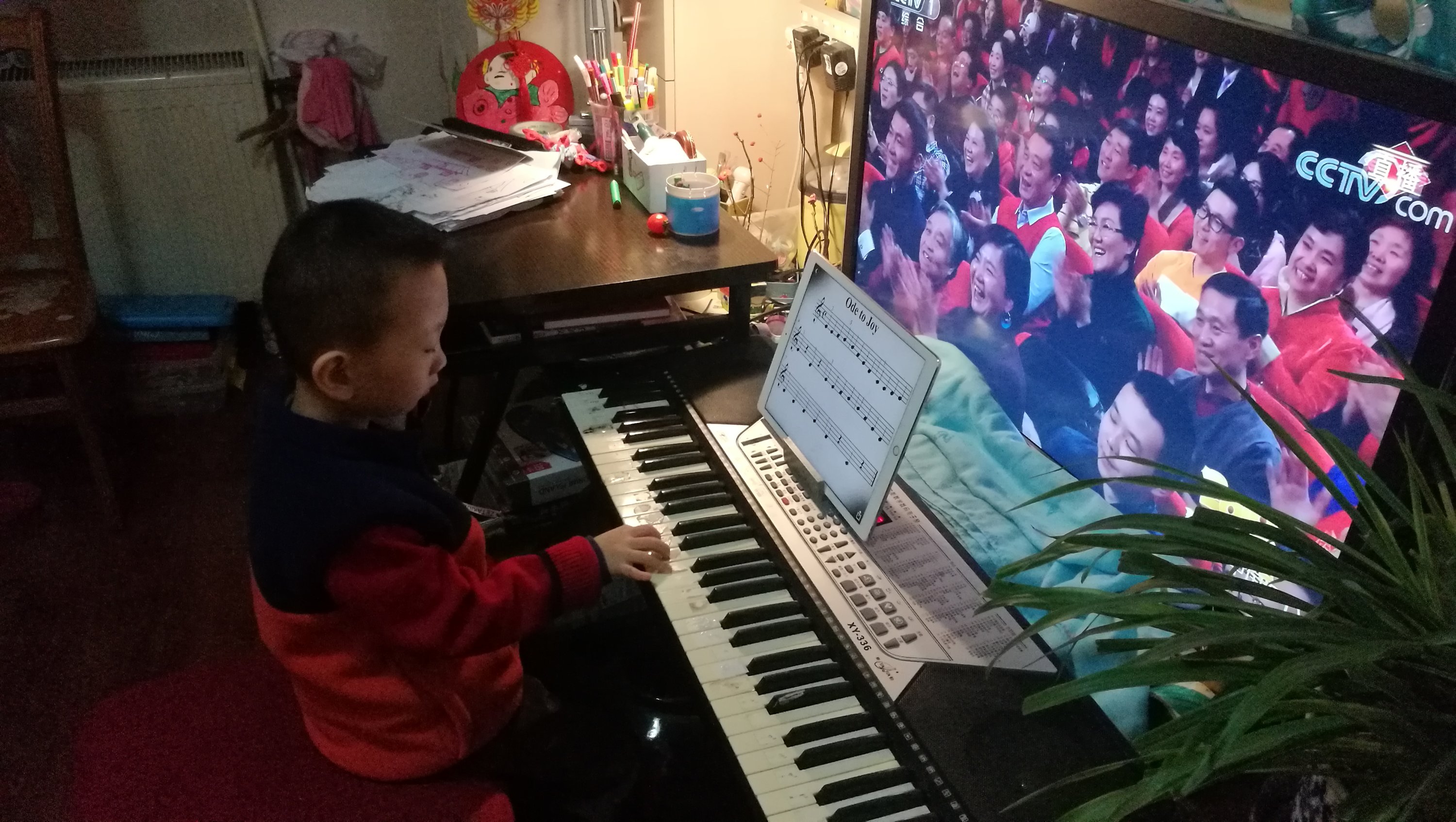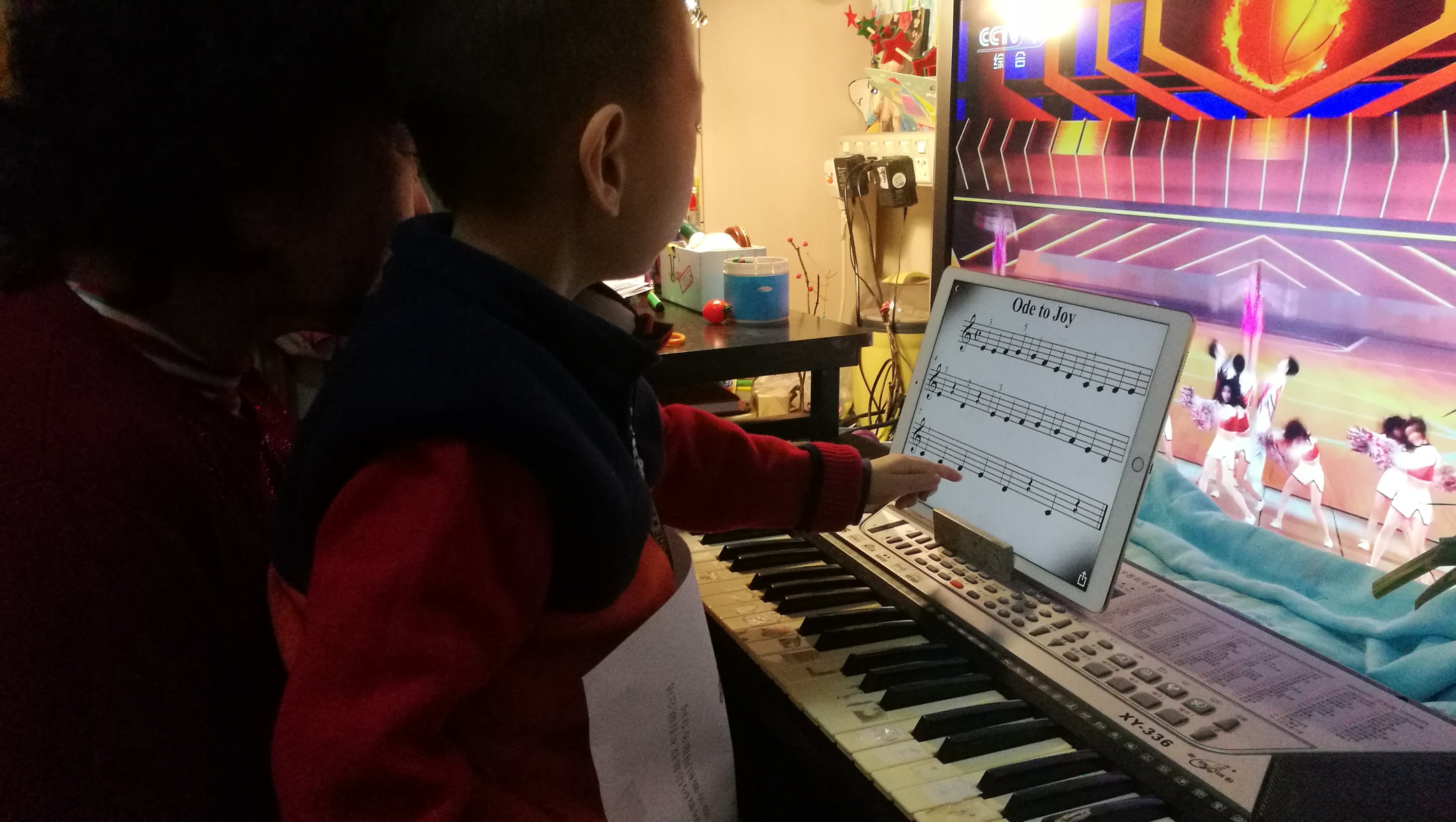 对照pad上的欢乐颂五线谱弹奏,乐乐自己基本可以完成,还能帮助姥姥识别五线谱?